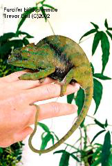 A medium-sized chameleon from the coastal rainforests of eastern and northeastern Madagascar, F. bifidus reaches total lengths of as much as 15-17 inches. It is one of the larger species of the bifidus group which includes F. minor, F. balteatus, F. wilsii, and F. petteri. Female bifidus lack the paired, pointed, spatulate rostral processes of the male. These processes are extensions of the canthi rostralis. The casque is flattened and lacks occipital lobes. Basic body coloration is green but may vary to browns and grays. A white line is often apparent on the ventral surface of the tail. Females tend to be a lighter green and may also exhibit an orange or even a red coloration with blue scales scattered over the head. There is a low dorsal crest but gular and ventral crests are absent. This is an oviparous species but little else is known concerning its reproduction and captive husbandry.